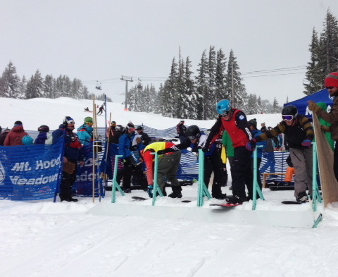 Getting ready in gates - I'm in red bib/blue helmet. Qtn Health helmet got crunched at start of season!.